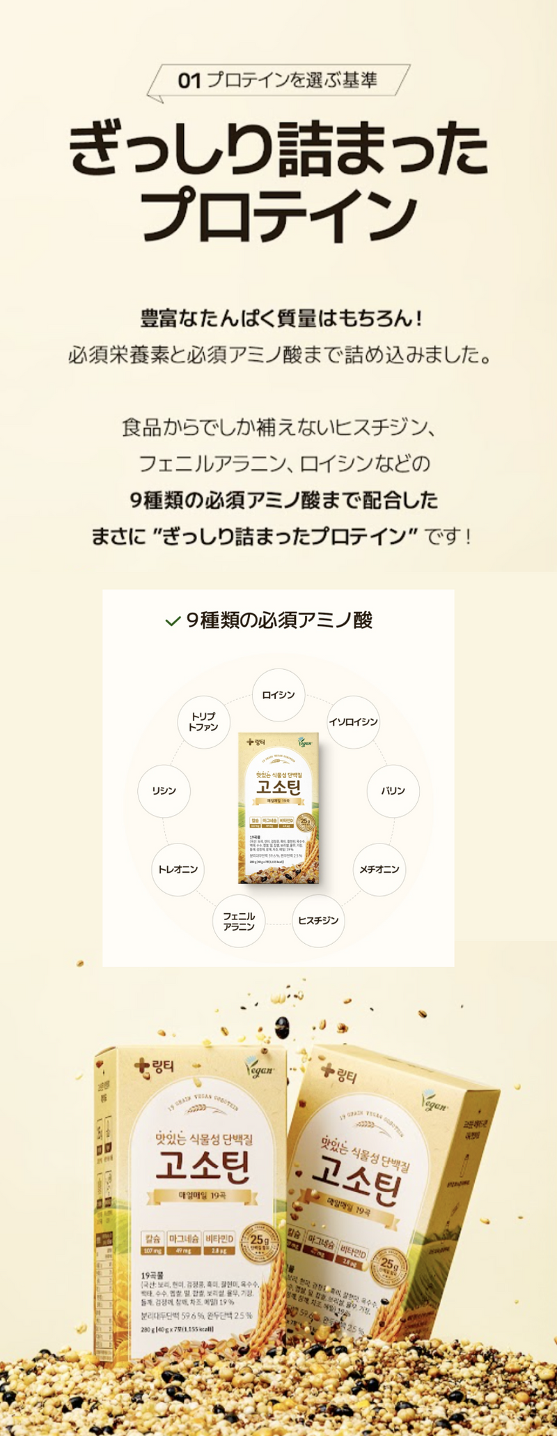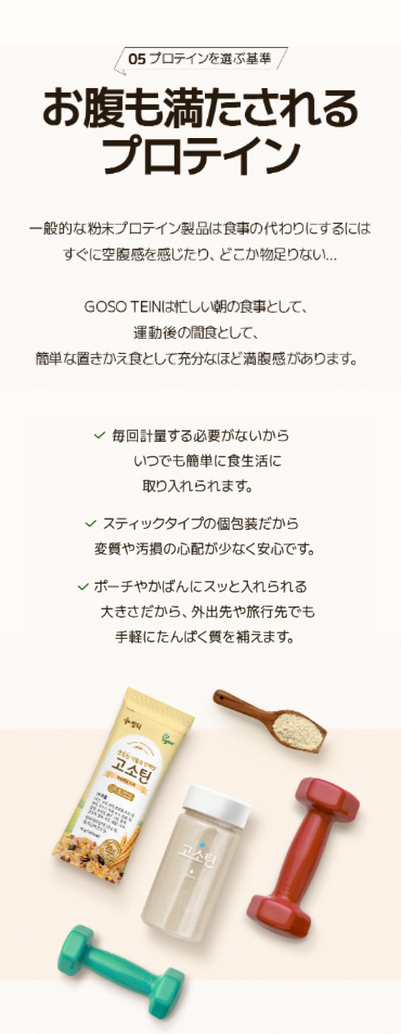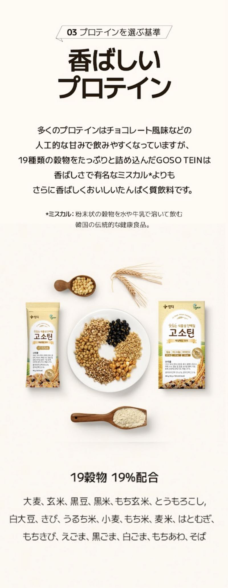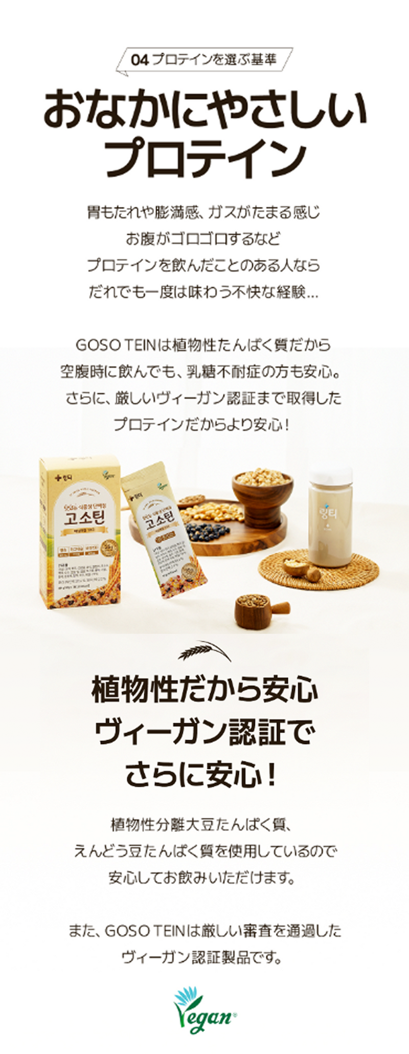 おなかにやさしい植物性プロテイン、GOSOTEIN。25gのタンパク質と19種類の穀物、9種類の必須アミノ酸など必要な栄養素がぎっしり詰まった、自然な味わいのプロテインで楽しく健康管理!