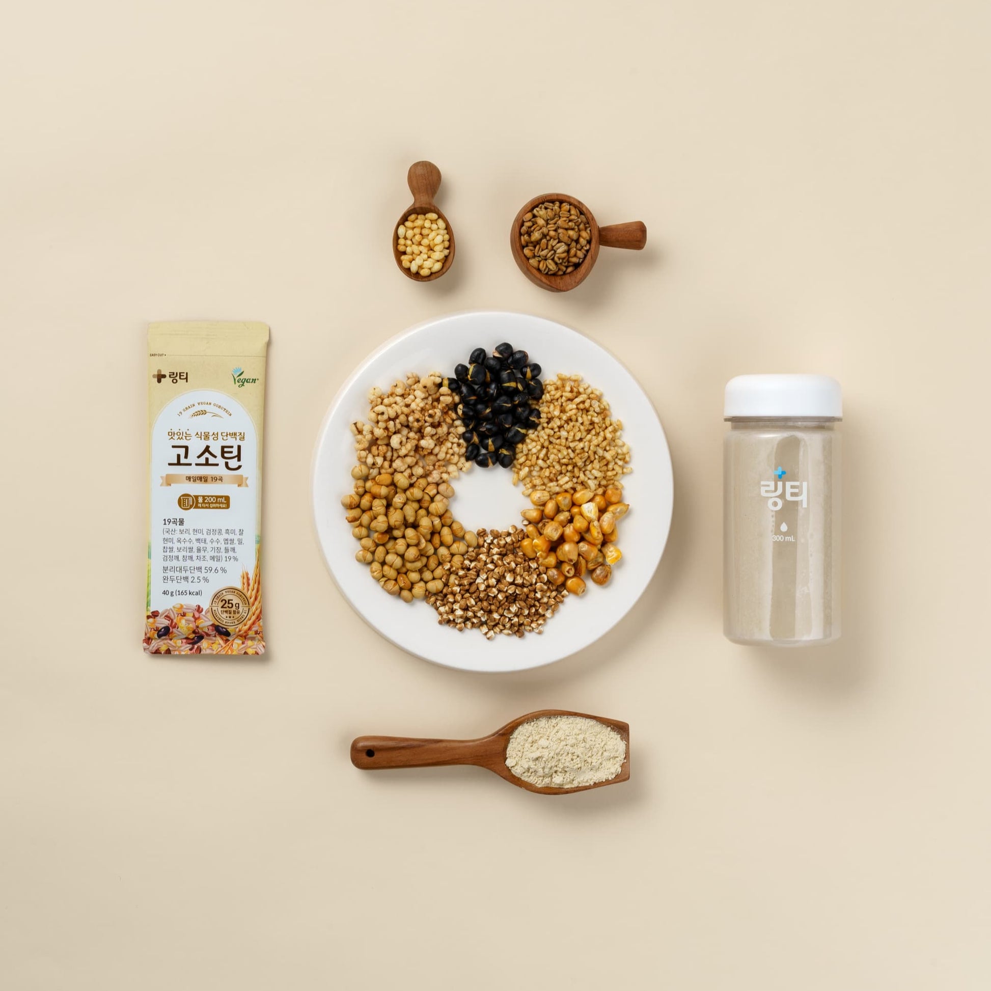 分離大豆たんぱく(アメリカ産:分離大豆たんぱく、レシチン)、穀物19種(韓国産:大麦、玄米、黒豆、黒米、もち玄米、とうもろこし、白大豆、きび、うるち米、小麦、もち米、麦米、はとむぎ、もちきび、えごま、黒ごま、白ごま、もちあわ、そば)、油脂混合粉末35[水あめ、パーム油(マレーシア産)、マルトデキストリン、加工でんぷん、第二リン酸カリウム、グリセリン脂肪酸エステル、ポリリン酸ナトリウム、二酸化ケイ素、ステアロイル乳酸ナトリウム]、結晶果糖、L-グルタミン、えんどう豆たんぱく、乳酸カルシウム、チコリ根抽出物粉末、煎り黒豆粉末、酸化マグネシウム、精製塩、乾燥酵母、混合製剤(L-フェニルアラニン、L-ロイシン、L-メチオニン、Lーリシン塩酸塩、L-イソロイシン、L-バリン、L-ヒスチジン、Lートレオニン、Lートリプトファン)、スクラロース(甘味料)