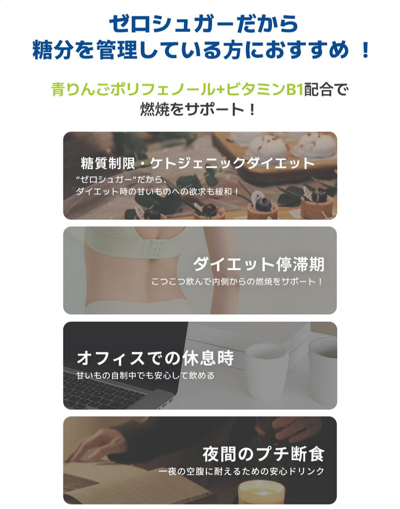 体脂肪管理をサポートしてくれる青りんごポリフェノールの含有量はそのままに、気になる糖分をカット!(エリスリトール、キシリトールを使用)