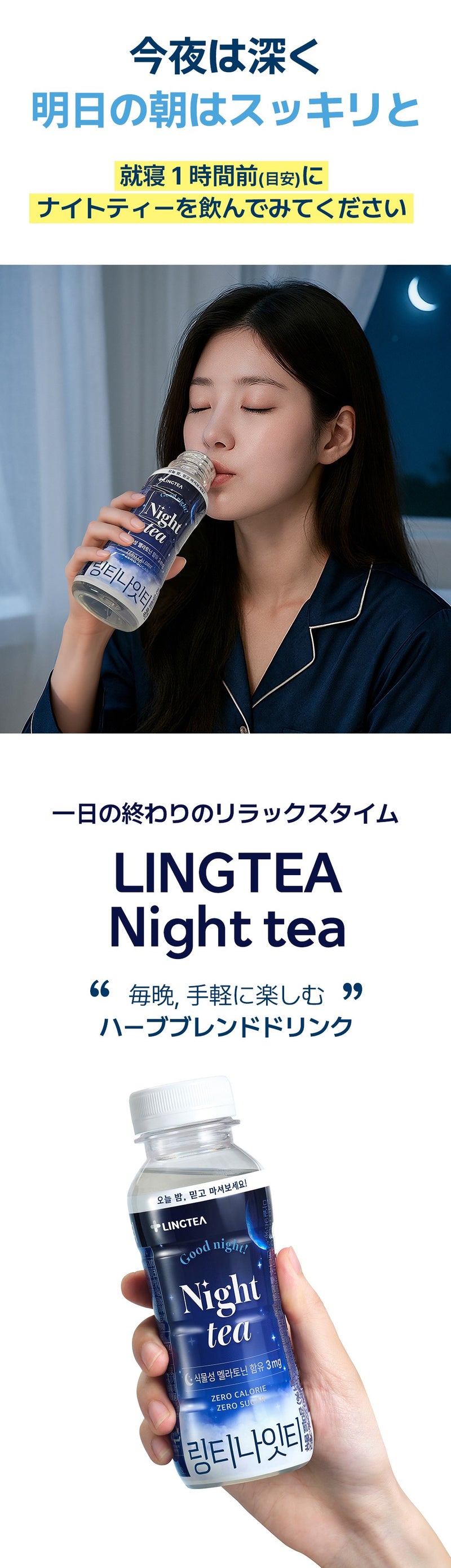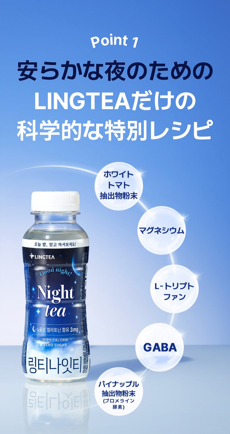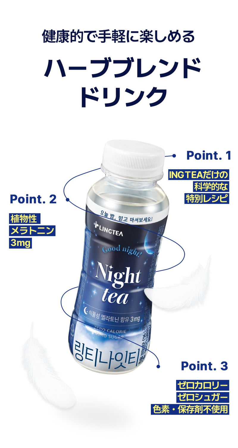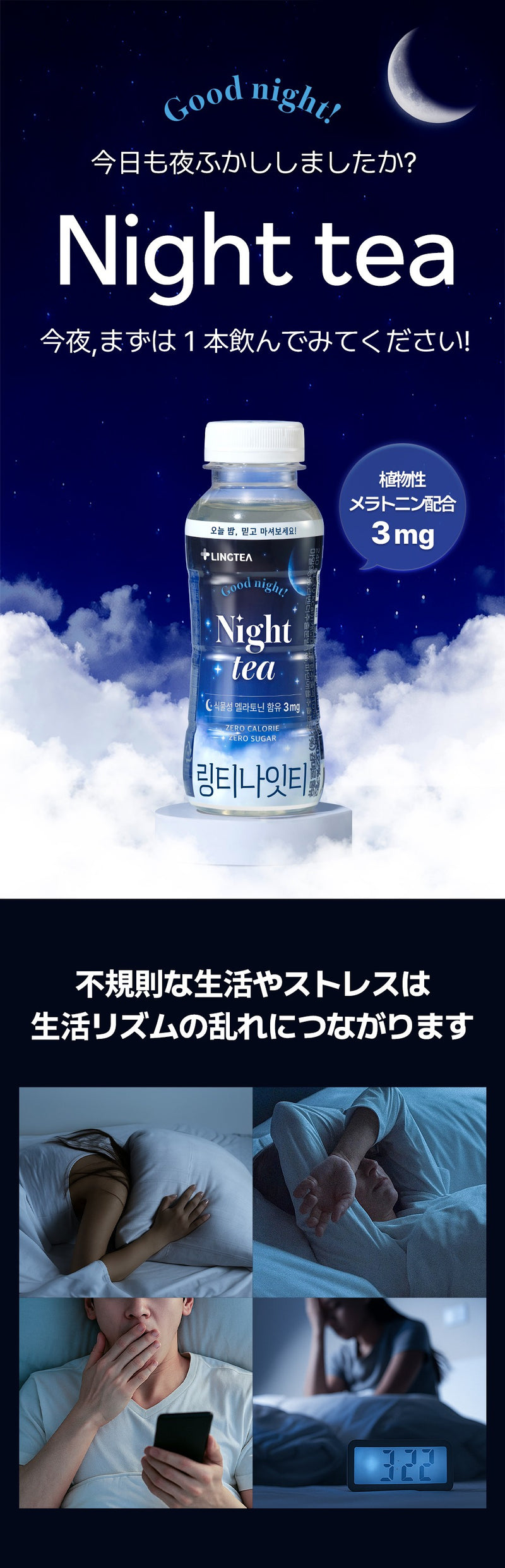 ホワイトトマト由来の植物性メラトニン3mg、L-トリプトファン、GABA等が配合された、ナイトケアドリンク、Night tea ナイトティー。